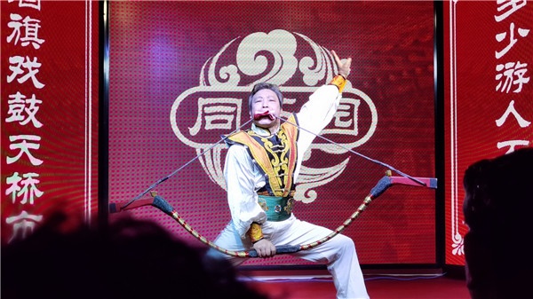 吴班主用牙拉开“霸王弓”梅开二度。虽然他今年已过六旬,但功力不减当年。